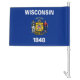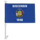 The flag of Wisconsin features a blue background with the state coat of arms in the center. "Wisconsin" is written in white at the top and the year "1848" in white at the bottom. The state coat of arms includes the motto "Forward," a badger (the state animal), and symbols representing farming, mining, and manufacturing. The top of the coat of arms reads "Great Seal of the State of Wisconsin" and below it are 13 stars, representing the original states.