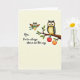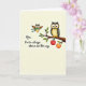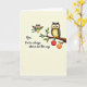 Designed with two stylized birds, the scene shows a larger owl perched calmly on a sturdy branch while a smaller bird glides in from the upper left, angled toward the owl as if drawn by trust and affection ❤️. The owl has a creamy chest and dark gray wings, and its wide eyes feel steady and reassuring as it faces the newcomer. The smaller bird wears a patterned green scarf, and its forward-leaning flight and lifted wings suggest an eager, friendly closeness rather than distance. Deep green leaves cluster around the rich brown branch, adding a cozy, sheltered setting that frames their gentle connection. Two rounded fruits hang nearby—one bright red and one golden orange—bringing a soft, homey touch to the moment 🌼. Beneath the illustration, the message “Mom, You’ve always shown me the way.” is centered in a dark gray, flowing handwritten style against the muted cream background. The overall palette stays warm and subdued, with the birds and fruit standing out clearly while the background remains smooth and light. The red apple sits to the right of the owl on the branch, with the golden-orange fruit nearby among the leaves.
