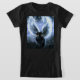 T-shirt featuring Wise One Fairy Cat by wildlife and fantasy artist Michaeline McDonald of a black cat with glowing blue and black wings against a black starry sky.