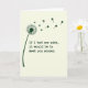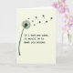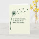 This card features a stylized dandelion in deep emerald green on the left, standing out against a creamy vanilla background 💚. The spiky seed head is partly shown, and the loose seeds drift away as tiny four-leaf clovers, as if a gentle breeze is carrying little lucky thoughts across the page ☘️. That clover trail arcs upward and to the right, creating a soft sense of motion that feels like reaching toward someone you care about. Near the lower area, the message “If I had one wish, it would be to meet you sooner.” is set in a simple sans-serif typeface. The text appears in dark green and sits neatly below the floating clovers, leaving plenty of open space around it. With only green on off-white, the scene feels quiet and close, like two people sharing a private moment and wishing their paths had crossed earlier. The smallest clovers thin out as they rise, ending in a light scatter near the upper right edge.