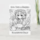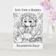 Cute adult coloring card for a friend. Cute anime girl in the garden wishing a friend a happy beautiful day.