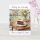 A birthday card with vintage vibes. A rustic wood kitchen table with a plate with birthday cake and vase of flowers in a mid century kitchen.