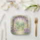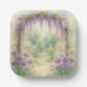 A delicate arch adorned with cascading lavender wisteria flowers and hydrangeas frames a serene garden path