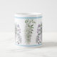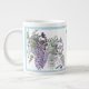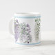 A Wisteria-lovers' delight floral jumbo mug with pendulous bowers of purple, lavender, and white wisteria vines, arranged foliage, trimmed in a pastel blue and lavender. Surely every housewife in the South will have to have at least two of these in the hutch!