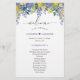An easy-to-customize Floral Wedding program paper sheet design featuring watercolor blue purple wisteria and yellow flowers and a big "welcome" in an elegant script, a beautiful wedding program for you to personalize. For further customization, please click the "customize further" link and use our design tool to modify this template. See the matching collection down below or check the link: https://www.zazzle.com/collections/wisteria_whispering_love-119995251004136537