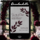 These elegant wedding save the date cards feature a rustic yet modern design with sprigs of burgundy or wine red colored watercolor leaves entering from both sides of the card on a gray background. The typography is unique and elegant with both left and right justified text. Simple and stylish, these cards are the perfect way to let your friends and family know about your upcoming wedding.
