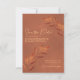 These elegant wedding save the date cards feature a rustic yet modern design with sprigs of hand painted rust or burnt umber colored watercolor leaves entering from both sides of the card on a marbled terracotta colored background. The typography is unique and elegant with both left and right justified text. Simple and stylish, these cards are the perfect way to let your friends and family know about your upcoming wedding.