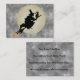 Silhouette of witch on a broomstick with fire coming out of the broom and a black cat perched on the handle against a round full moon.