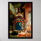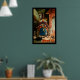 Decorate your wall with a fantastic vintage Halloween poster featuring a witch sitting with her owl and cat at her fireplace.