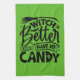 This Halloween-themed design features the playful phrase "Witch Better Have My Candy" arranged in a dynamic, mixed-font layout. The word "Witch" is displayed in bold, blocky letters, while "Better" is written in a cursive, flowing script, adding a sense of urgency and fun to the design. The phrase "Have My" is enclosed within a banner, further emphasizing the demand. The word "Candy" stands out at the bottom in large, block letters, with small skull illustrations integrated into the design. Additional Halloween elements, such as a witch's broomstick, a bat, a star, and wrapped candy, are scattered throughout the composition, enhancing the spooky and festive feel.