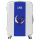 This custom carry on suitcase has a witch wearing a long purple dress sitting beside her black cat on a white crescent moon on a deep blue background with tiny white sparkle like flecks. Customize your initials or name with the template.
