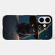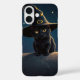 Magical black cat sitting on a crescent moon with a witch hat. A charming Halloween phone case design for cat lovers and spooky nights.