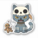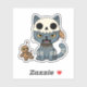 Angry looking cat with tattoo markings, bone necklace, and a skull on top of its head is sitting beside a voodoo doll with pins.