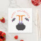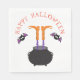 These cute Halloween paper plates feature orange booted witch's feet with blue and black striped stockings sticking upside down from a black cauldron. Little black bats with purple wings fly at each side. The orange text says "Happy Halloween" in a semi circle. The image is placed on a white background. Cute, especially for kids, or for any Halloween celebration. Graphics by Prettygrafik Design, © Prettygrafik.com