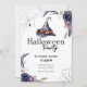 Join us for a Halloween party that's enchantingly elegant! This beautiful and unique invitation perfectly blends spooky fun with sophisticated floral style. The design features a classic witch's hat at its center, surrounded by beautiful watercolor bouquets of moody purple and white flowers. Delicate spiderwebs and a dangling spider add the perfect touch of Halloween spirit. With its mix of classic serif and modern script fonts, this invitation is ideal for a stylish costume party, a "witches' night out," or any Halloween gathering that calls for a touch of class.