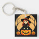 Cute illustration of a young witch with orange hair surrounded by jack-o'-lanterns. The magical atmosphere is highlighted by bats flying under a full orange moon, creating a playful Halloween mood.