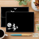 Stylish and minimal black and white Halloween design featuring Destei's silhouette of a long hair witch woman flying on a broomstick. The witch is wearing a long dress, high heel shoes and a witch's hat. The moon is shining behind the witch and there are three bats flying over it. A cat sits on the front of the broomstick.