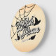 Halloween themed pillow with a vintage graphics of a witch, cat, broom and moon.