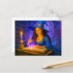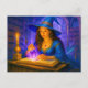 Witch reading spellbook with glowing crystal holiday postcard