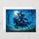 A mysterious witch rides a goat through the moonlit forest while casting blue magic. Dynamic fantasy artwork full of wild energy.