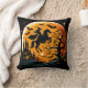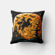 A witch gallops on her horse under a glowing orange moon, surrounded by bats, with a haunted castle and eerie trees in the Halloween night sky.