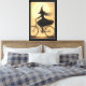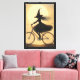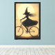 This enchanting artwork features the silhouette of a witch riding a bicycle under a glowing full moon, her long hair and flowing dress trailing in the wind. Surrounded by flying bats, the scene blends whimsy and mystery, making it a charming piece for Halloween décor or lovers of magical, gothic-inspired art.