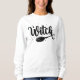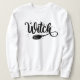 This black-and-white design features the word "Witch" in a bold, flowing script font, with the tail end of the letter "h" transforming into the handle of a broomstick. The text is stylized with a playful, handwritten look, adding a whimsical touch to the overall theme. Surrounding the word are scattered stars, creating a magical, starry-night effect that enhances the witchy theme. The broomstick, positioned diagonally under the text, adds a dynamic element to the design, suggesting movement and adding depth.