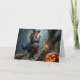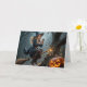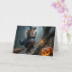 A witch riding a broom while texting on her cell phone collides with a tree near a glowing jack-o-lantern.