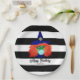 Decorate your party table with these Witch Theme Halloween Birthday Chic Personalized Paper Plates. Each is modern spooky designed with a witch and she is wearing a face mask. She has a green face and bright orange hair. The background is modern designed with black and white stripes and the custom text "happy birthday" in black trendy handwritten script lettering. Personalized with name or your custom text.