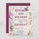 A witch and wizard magical themed children's Birthday Party Invitation. On a gray mottled scroll background, magical themed objects including a hat, owl, scroll, broom stick, caldron and dragon surround the purple decorative text that reads Witches and Wizards, please join us for Your Name Your Year Birthday. Personalize by adding your full event and contact details.