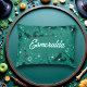 A tossed pattern of hats, broomsticks, mushrooms and bubbles. Large space for pet name customization.