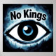 This striking poster centers on a captivating evil eye, painted with a mesmerizing gradient of blues and blacks that draws you in like a modern-day oracle. The eye's gleam is sharp and precise—an emblem of clarity, insight, and vigilance. Above this all-seeing gaze, the commanding phrase “No Kings” challenges the status quo, breaking outdated power structures with a rebellious spirit. The sharp contrast between the deep black text and the illuminated swirl of blues surrounding the eye infuses the design with urgency and dynamism. Finished as a oil paint art print.