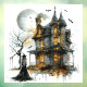 A shadowy figure in a pointed cloak stands before a decaying gothic house, its twin towers glowing with eerie yellow light. Leafless trees claw at the sky while bats swirl beneath a cloud-veiled full moon. Fallen leaves and scattered pumpkins line the path, setting the stage for a haunting encounter. With its moody palette and vintage horror aesthetic, this scene conjures the quiet thrill of Halloween night—mysterious, magical, and steeped in autumn lore.