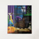 A cozy yet mysterious fantasy painting featuring a brown cat dressed in a purple witch’s hat, resting atop an open spell book as potions bubble nearby. Set beneath a glowing full moon and framed by rich purple curtains, this enchanting scene blends feline charm with classic witchcraft imagery. Perfect for Halloween lovers, witchy decor fans, and cat enthusiasts, this artwork adds magical warmth with a whimsical spooky aesthetic