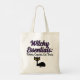 Adorable tote bag ideal for your friendly witch. A fun design featuring a black retro style cat with big yellow eyes sitting beneath the witchy writing. Above the cat in a purple font with a black outline are the words, "Witchy Essentials" and below that are the words, "Potions, Crystals, Cat Treats" in a black text.