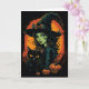 Witchy Halloween Card - a beautiful witch with green skin, wearing her black hat with a girly bow on the front. She is accompanied by her faithful familiar - her black cat who is staring at you with captivating orange eyes. The pumpkins have been carved; grinning, toothless and cold, triangular eyes. Set on a black background with orange colored frames. Inside is the message - Have a spooky Halloween.
