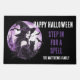 This whimsical Halloween door mat features a charming design perfect for adding a festive touch to your doorstep. At the center, a stylized witch with a wide-brimmed hat and a black cat, set against a large, glowing full moon in shades of purple and white. The top of the mat proudly displays “HAPPY HALLOWEEN” in an eerie font, while the bottom invites guests with the playful pun “STEP IN FOR A SPELL,” referring both to a magical incantation and a short visit. The mat also includes a customizable family name, making it a unique and personal addition to your Halloween decor. The family name can easily be changed or removed by clicking “Personalize this Template.”