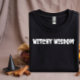 Halloween teacher T-shirt featuring white typography and a humorous phrase. This T-shirt is designed for teachers to wear during Halloween. The design includes the phrase "Witchy Wisdom" displayed in white typography. The shirt is intended to be a fun and lighthearted way for teachers to celebrate the Halloween season. The white text stands out on the T-shirt, making the message easily readable. The phrase "Witchy Wisdom" adds a touch of humor to the Halloween theme.