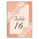 Elegant white lace with pearls coral orange wedding table number place card featuring white lace with beige/ecru pearls on coral orange that covers two corners of a white rectangle with coral orange border. Text in brown. Note that lace is “printed on” and not real fabric. This elegant, shabby chic sophisticated and romantic design is part of a wedding set and is perfect for a chic spring, summer or fall/autumn wedding.
