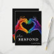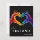 Introducing the RSVP card from the vibrant "Heart of Pride" collection, featuring beautiful artwork on the front. The front caption reads "Please RSVP" along with the response date, inviting guests to confirm their attendance with elegance and inclusivity. The design showcases the iconic "Heart of Pride" artwork—two hands forming a heart gesture in radiant LGBT colors—set against a deep black background, creating a striking and meaningful statement.
