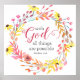 Typography design with caption in white letters, "With God All Things are Possible.” Design is centered inside colorful watercolor floral wreath. Bible verse is from Jesus' words in from Matthew 19:26.