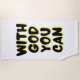 This beach towel design has the words "With God You Can" in a bubble style print plus black letters and yellow shadow outline with a typograph style in this faith based theme. The front of this towel is a polyester blend, the back is 100% cotton with vibrant sublimation printing that is designed to last. Enjoy this towel for your next picnic, beach getaway or any outdoor activity you may attend all towels are machine washable with recommended low speed tumble dry.