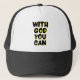 This trucker hat design has the words "With God You Can" in a bubble style print plus black letters and yellow shadow outline with a typograph style in this faith based theme. This hat is comfortable, casual and adjustable from 17 to 24" with a 100% nylon foam front and nylon mesh back great for everyday use or any special occasion.