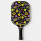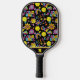 Black , Pickleball Paddle with Groovy, retro 90s style pickleball pattern with yellow pickleballs and black background. Great gift for dad