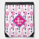 With name & initial, pastel pink and purple tennis rackets with purple tennis balls on classic white background. Cute pattern for tennis players and fans. Drawstring bag with tennis pattern. Great as a gift for tennis player. Monogram and custom name in the middle