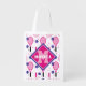 I own a lot of reusable grocery bags, but this one holds its box shape and simply stands up on its own even if there is nothing in it. Its stiffer than your regular reusable bag too, and the material is water resistant. I poured water on the exterior and it didn't penetrate inside to the other side. I'm buying a couple more. Wish I knew how durable these bags were or I would have purchased a few more with my initial order. I also like how it folds and buttons up when not in use, making it easy to put into a handbag or luggage. I haven't used this bag yet, as I purchased it for travel use, like when you're at the airport and need to small sturdy bag to place any airport purchases in, like food, souvenirs etc. I can tell you when you first see this bag, it looks very cheap, but after closer inspection of the material and the seams its a very sturdy reusable bag. I tested it out by putting some really heavy objects inside and I could not observe any stress to the bag at all. Another thing I like about it, is the fact the medium size that this is makes it easy to just carry it in your hand without the bottom of the bag scraping the ground, like most other bags do when you're short. That alone, deserves 5 stars. I just wish there were more colors to choose from! The PDX Airport Carpet printing looks just like the photo, and using this bag during travel might be a conversation piece when/if a native from Oregon happens to see it.