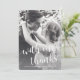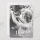 A modern wedding thank you card designed to accommodate your favorite full-bleed vertical or portrait oriented wedding photo. "With our thanks" appears at the bottom as a white calligraphy script text overlay, with your names and wedding date beneath. Add an optional message to the subtly patterned back using the fields provided, or delete the sample text to add your own handwritten message of thanks.