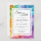 Introducing the "Ethereal Bloom Collection" save-the-date card, offering an elegant preview of the vibrant artistry that will surround your forthcoming celebration. The front of this card showcases mesmerizing alcohol ink artwork in swirling hues of blues, purples, reds, oranges, and greens, with ethereal double-exposed lilies framing the design. The gentle caption "Save the Date" is followed by the couple's names, wedding date, and location, all elegantly presented to set the perfect tone for your special day.