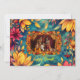 The frame of this "Happy Diwali" greeting card is adorned with large, vibrant floral elements, primarily in shades of gold, yellow, pink, and orange. The flowers, which appear to be lotuses and dahlias, are scattered across a rich blue-green background, creating a striking contrast. Delicate leaves in complementary shades enhance the design, adding depth and movement around the frame.