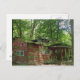 A charming red cabin with small white shutters has lost its battle with mother nature and lost its roof. Great Smoky Mountains, Tennessee.